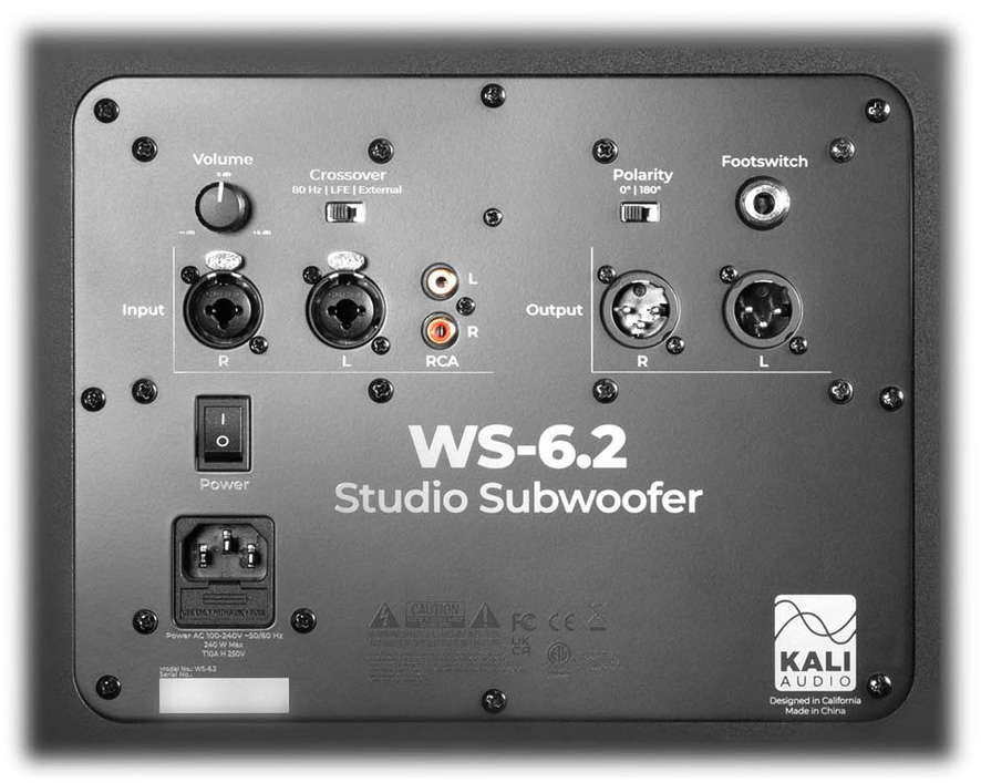 XLRまたはTRS端子に対応するバランス入力に加え、アンバランスRCA入力も装備しています。クロスオーバー設定は、モニターの低域拡張に適した80Hzモード、専用チャンネル用のLFEモード、外部機器を使用するためのクロスオーバー・オフ(External)から選択可能。80HzクロスオーバーはKali Audio製モニター向けに設計されていますが、主要な他社製モニターとも良好に動作します。